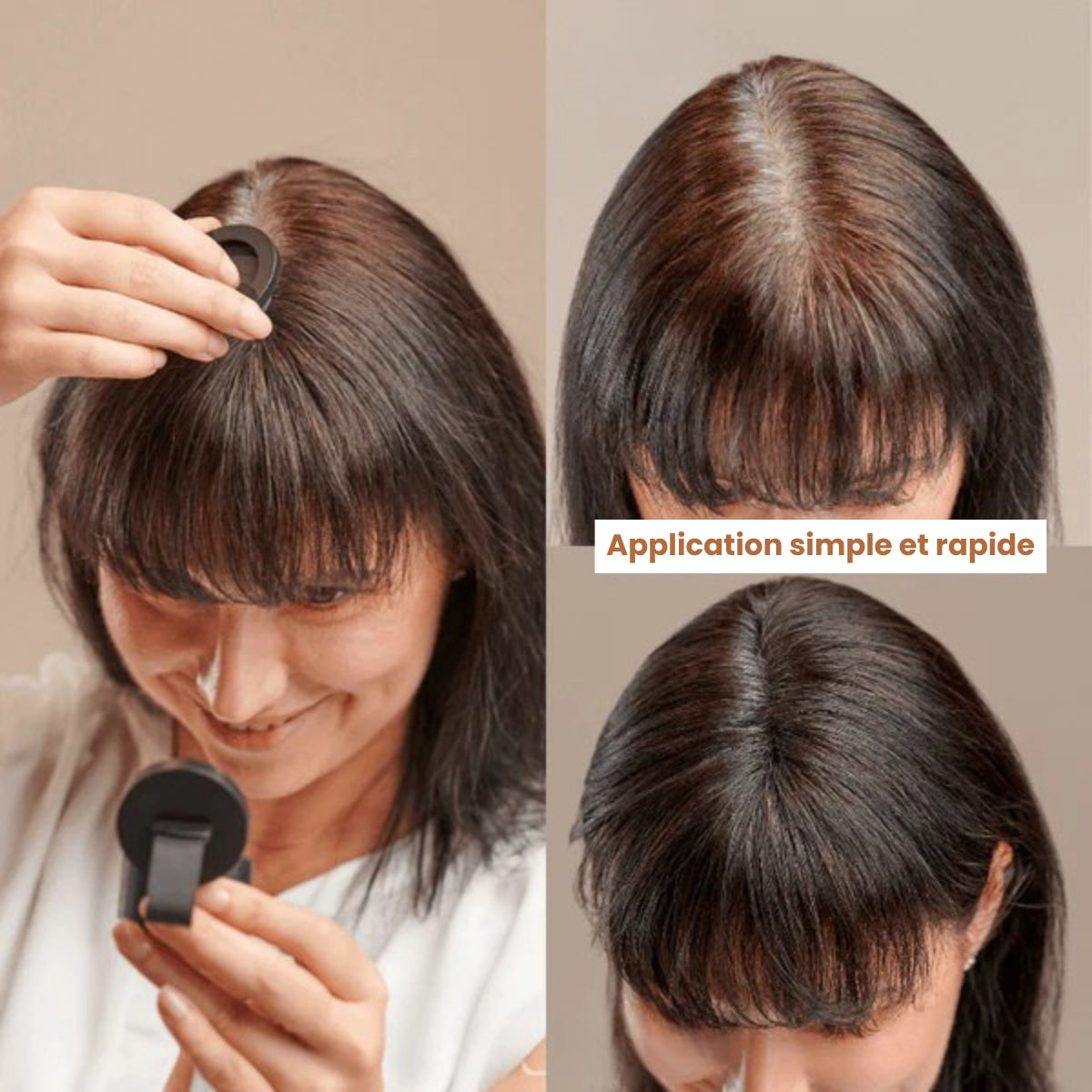 Prélevez la poudre avec l’applicateur, puis tapotez doucement le long de la raie, des racines ou des petites zones clairsemées.