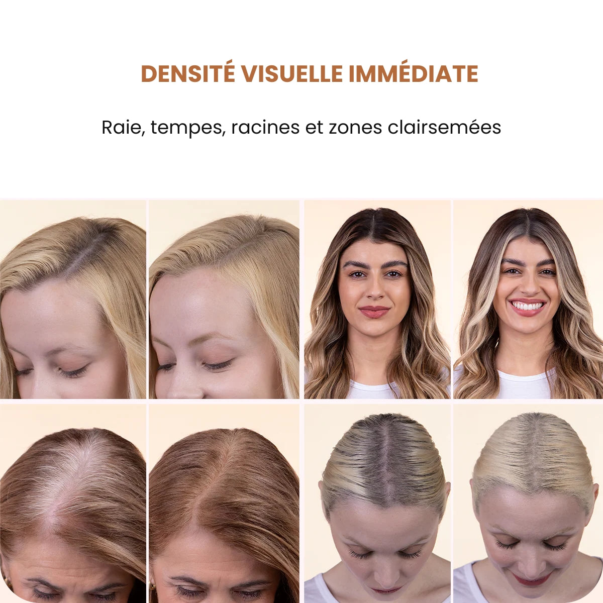 Avec la repousse, la raie peut paraître plus large, les racines plus claires et quelques petites zones laisser davantage voir le cuir chevelu, surtout sous certaines lumières ou sur les photos.